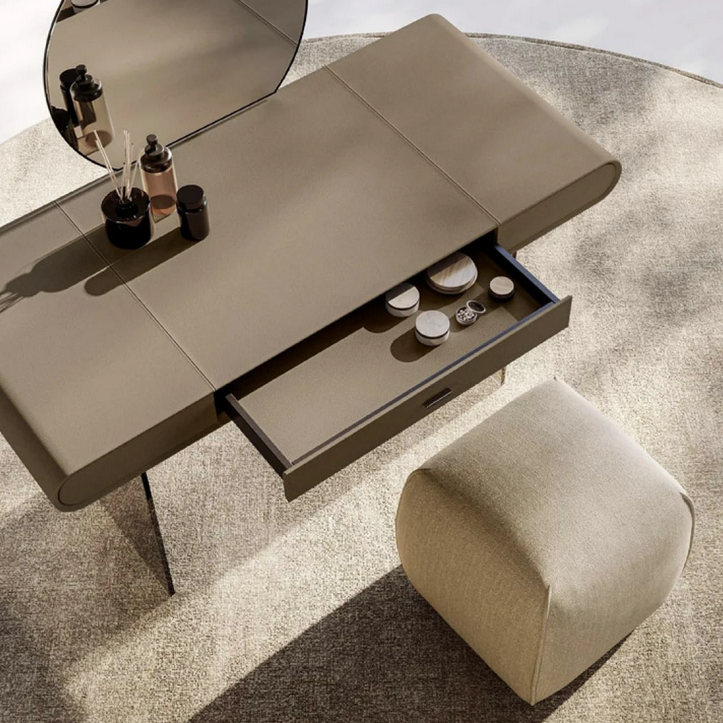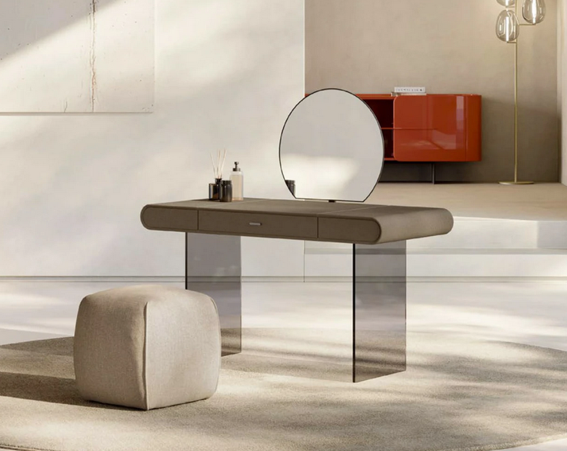BICE VANITY – ΣΧΕΔΙΑΣΗ NELLO PALOMBAΗ τουαλέτα Bice αποτελεί μια σύγχρονη εκδοχή του κλασικού μπουντουάρ, με κομψές γραμμές και μοναδικό χαρακτήρα. Διαθέτει επενδεδυμένη δερμάτινη επιφάνεια και γυάλινα πόδια σε διάφανο, καπνιστό ή μπρονζέ φινίρισμα, που προσδίδουν ελαφρότητα και μοντέρνα αισθητική. Συνοδεύεται από κεντρικό συρτάρι και φινιρισμένο καθρέφτη extra-clear με λοξό κόψιμο για μια αίσθηση πολυτέλειας.