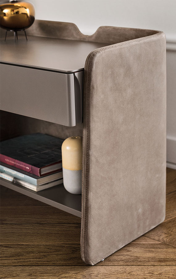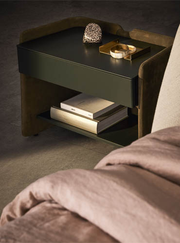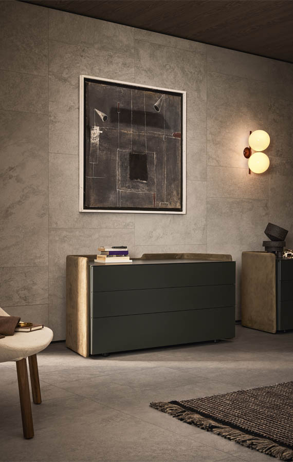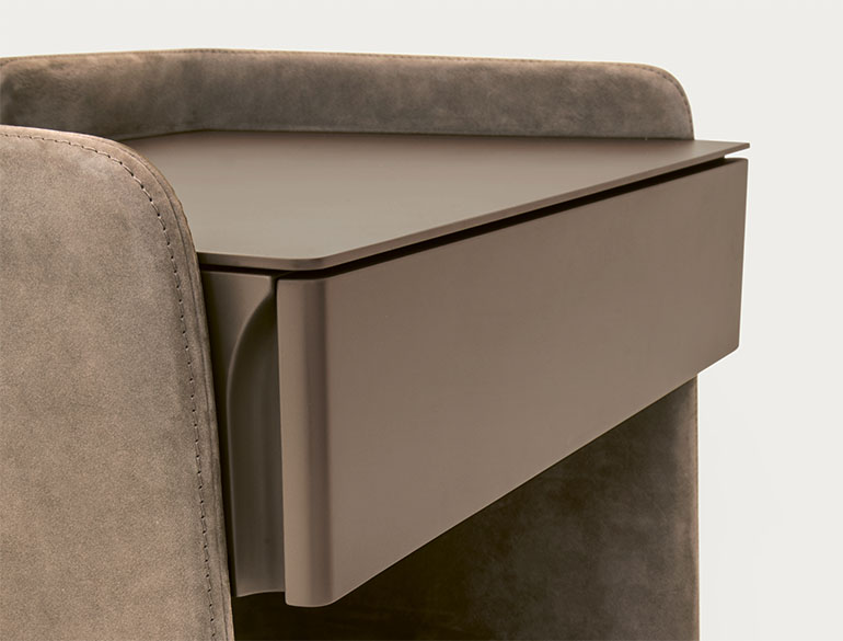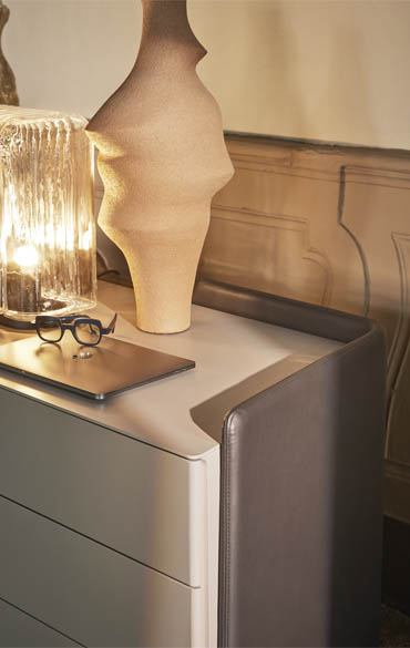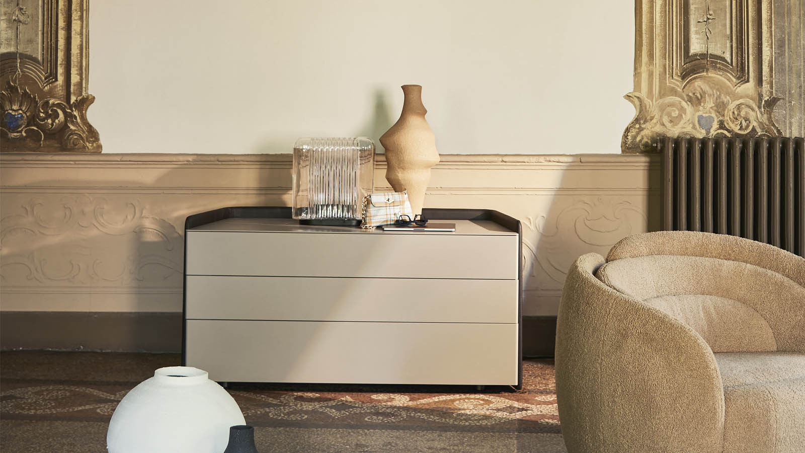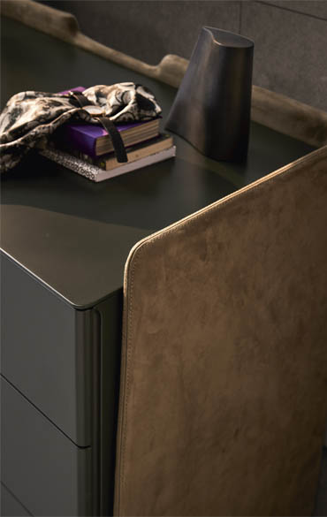 Η συνέχεια των επιφανειών και η απουσία λαβών υποδηλώνουν έναν σχεδιασμό διακριτικής κομψότητας. Μια λεπτή εγκοπή στο ξύλινο πλαϊνό των συρταριών επιτρέπει το άνοιγμα με φυσικό και εργονομικό τρόπο.
