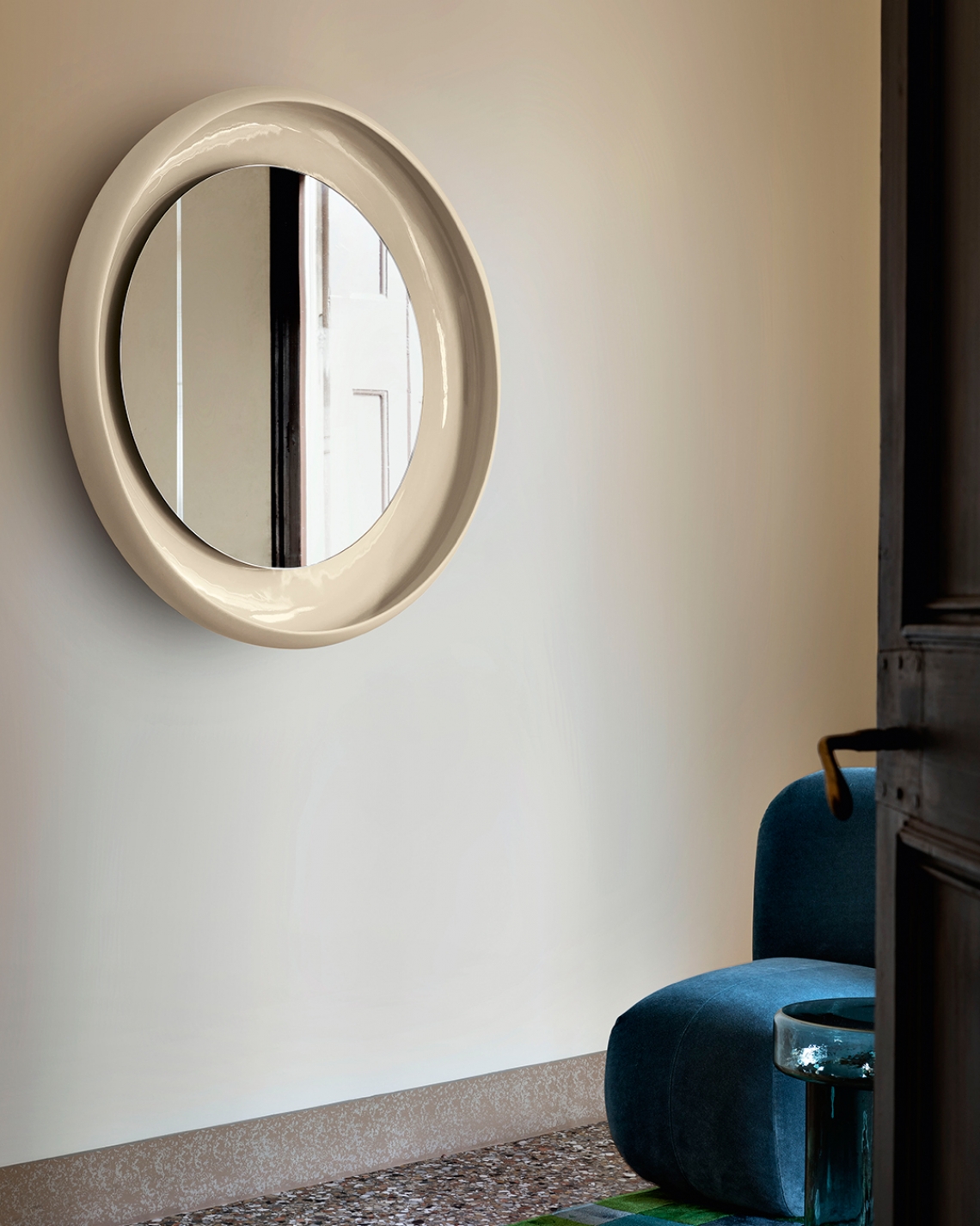Το Coque ξεχωρίζει για τον δυναμισμό και τα έντονα, πλούσια κοντράστ του. Ο καθρέφτης προστατεύεται από ένα κεραμικό κέλυφος που αγκαλιάζει δύο αντίθετα φινιρίσματα: γυαλιστερό και ματ. Η εσωτερική επιφάνεια είναι σμάλτωμένη και λαμπερή, ενώ η εξωτερική έχει υφή. Μεταμορφώνει τον καθρέφτη σε ένα πολύτιμο αντικείμενο που αναδεικνύει τα φυσικά υλικά, με αντανακλάσεις που δίνουν βάθος και ζωντάνια στο χώρο σας.
