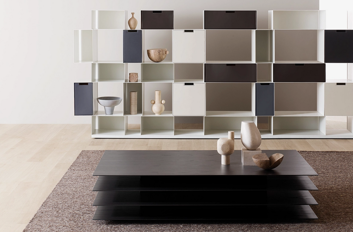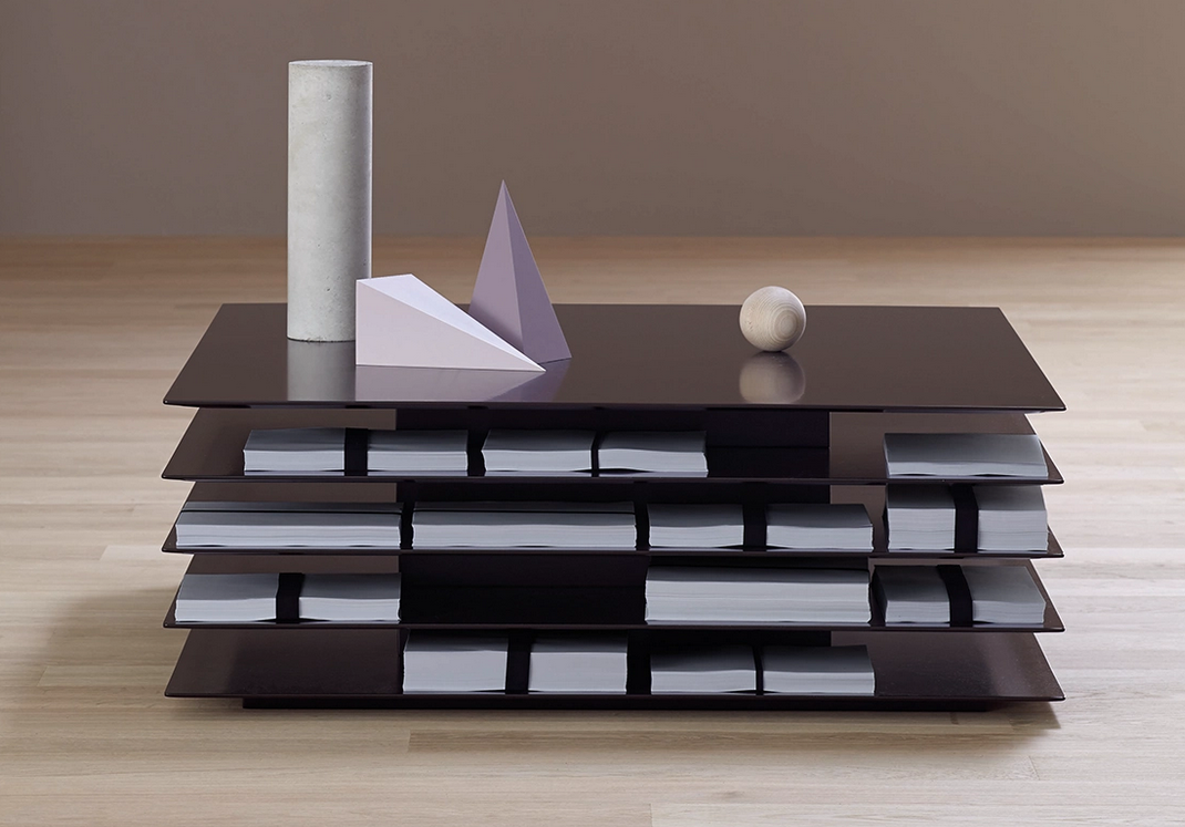 Το τραπέζι Millefoglie, εμπνευσμένο από το γνωστό γλυκό, αποτελείται από στρωμένα επίπεδα που δημιουργούν ένα κομψό παιχνίδι όγκων σε τέλεια ισορροπία. Συνδυάζει ελαφρότητα και σταθερότητα, λειτουργώντας ταυτόχρονα ως τραπέζι και πρωτότυπη βιβλιοθήκη ανοιχτή από τις τέσσερις πλευρές.